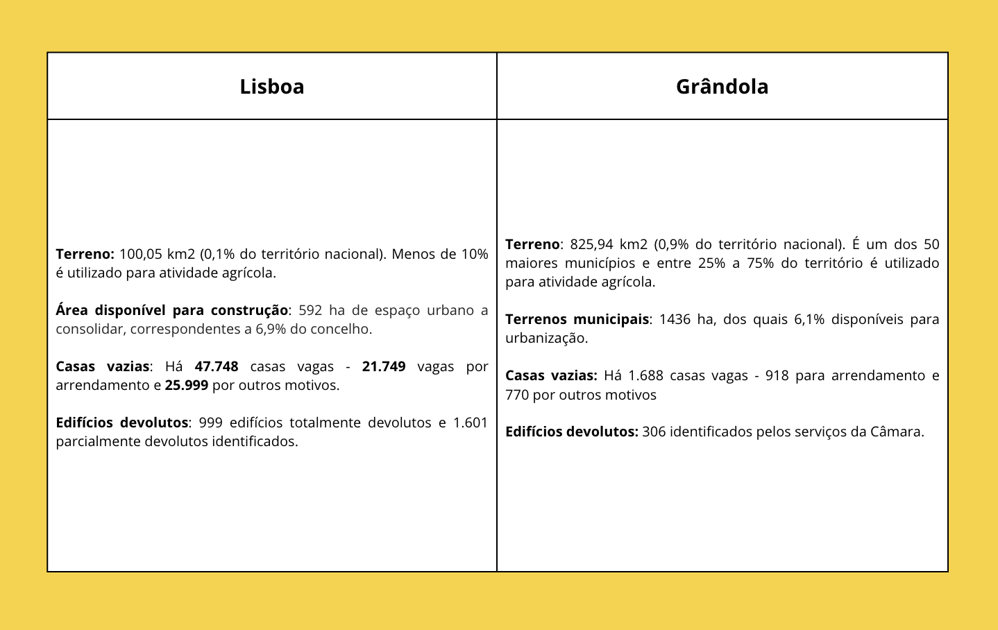 Em Grândola, de acordo com a Carta Municipal de Habitação, existe potencial para a construção de cerca de 1.400 novos fogos, dos quais 160 de propriedade municipal. A diferença explica-se pelo facto de a maioria dos terrenos pertencentes à Câmara não se situarem em solo urbano. No total, o município detém 1.436 hectares de terrenos, dos quais apenas 6,1% corresponde a solo urbano disponível para construção.