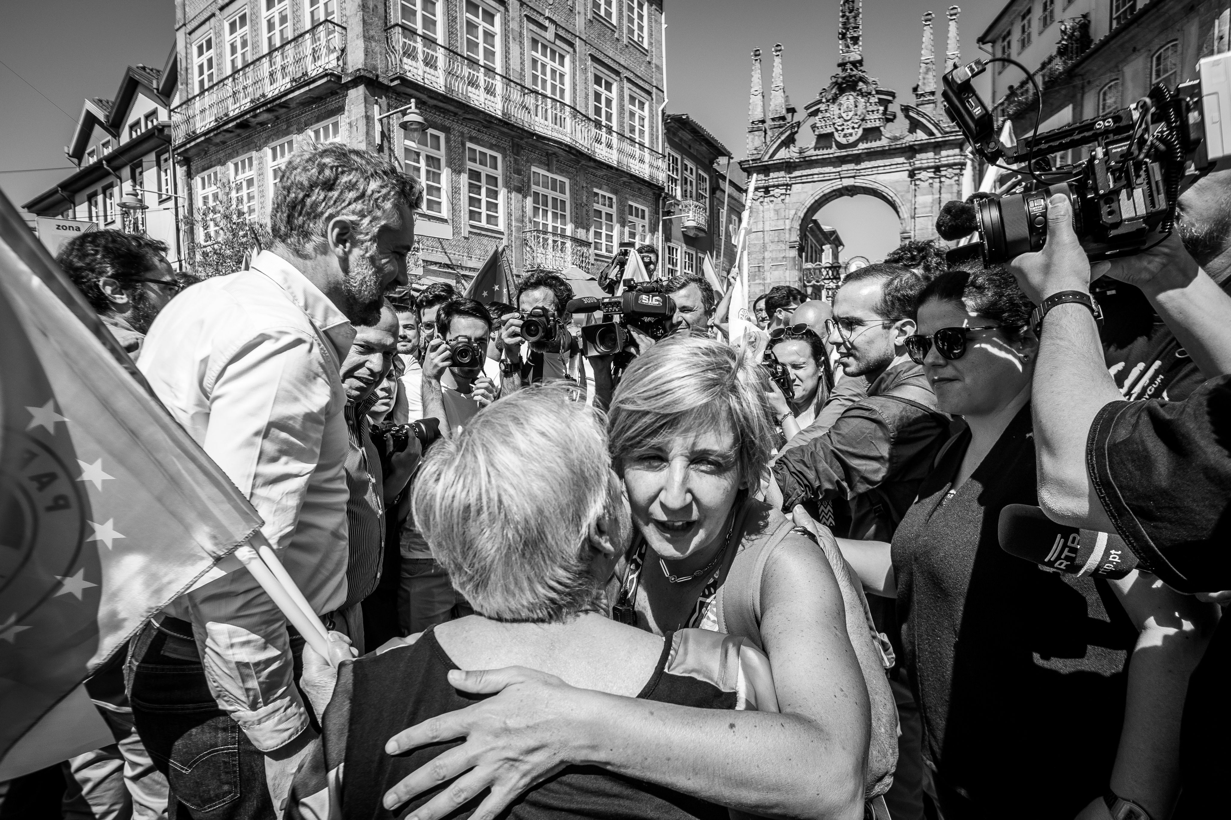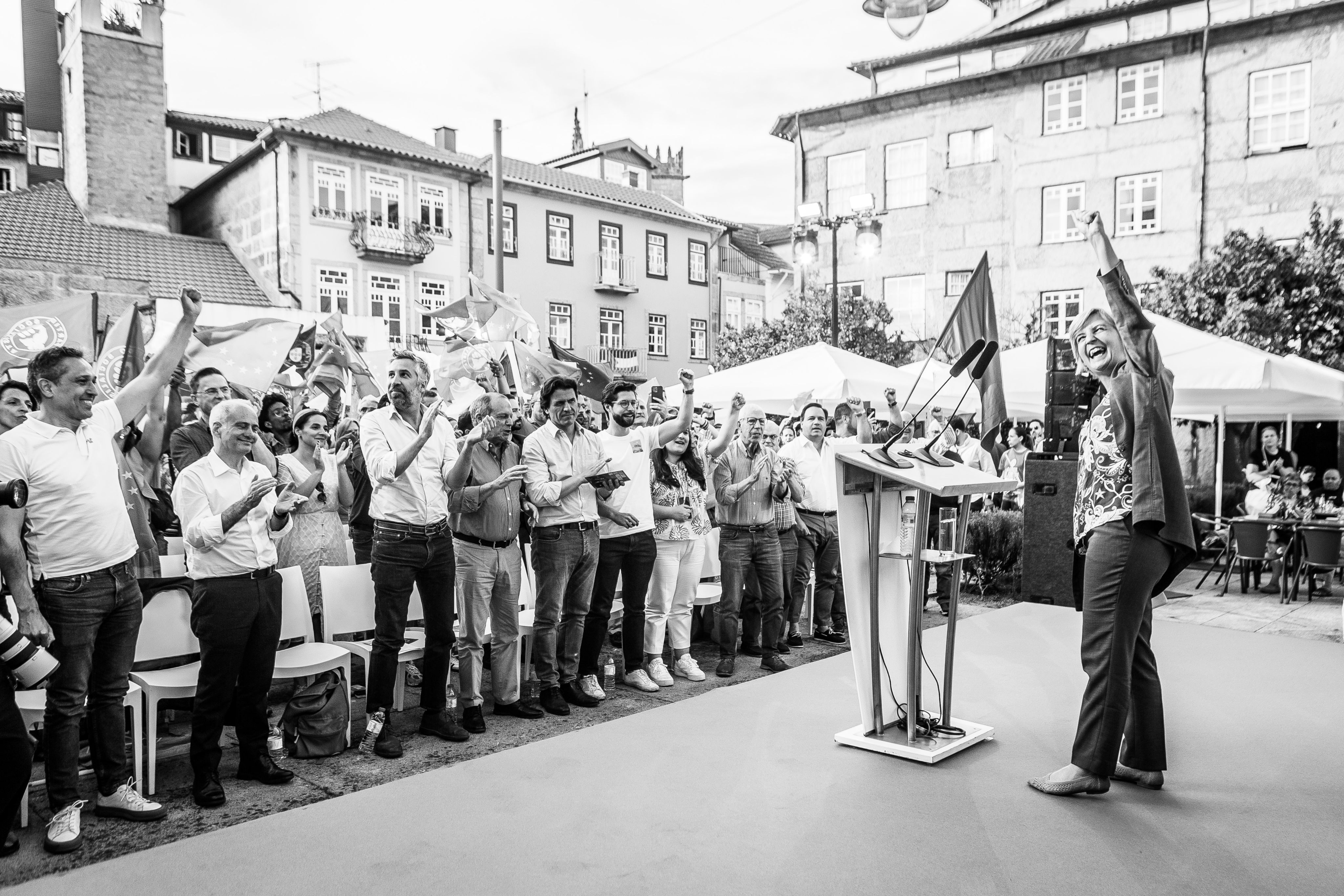 Há várias horas que a candidata não está sozinha. Desde que acordou em Viana do Castelo até ao momento em que entrou no carro para seguir viagem até Guimarães já distribuiu dezenas de flyers, beijinhos e apertos de mão, sempre cercada por uma equipa que não lhe tira os olhos de cima. A pressão aliviou com a chegada de Pedro Nuno Santos, que lhe roubou o foco em vários momentos, mas não foi suficiente. Agora que faltam cerca de duas horas para o comício, a entrada na viatura é interdita: há um discurso para preparar.