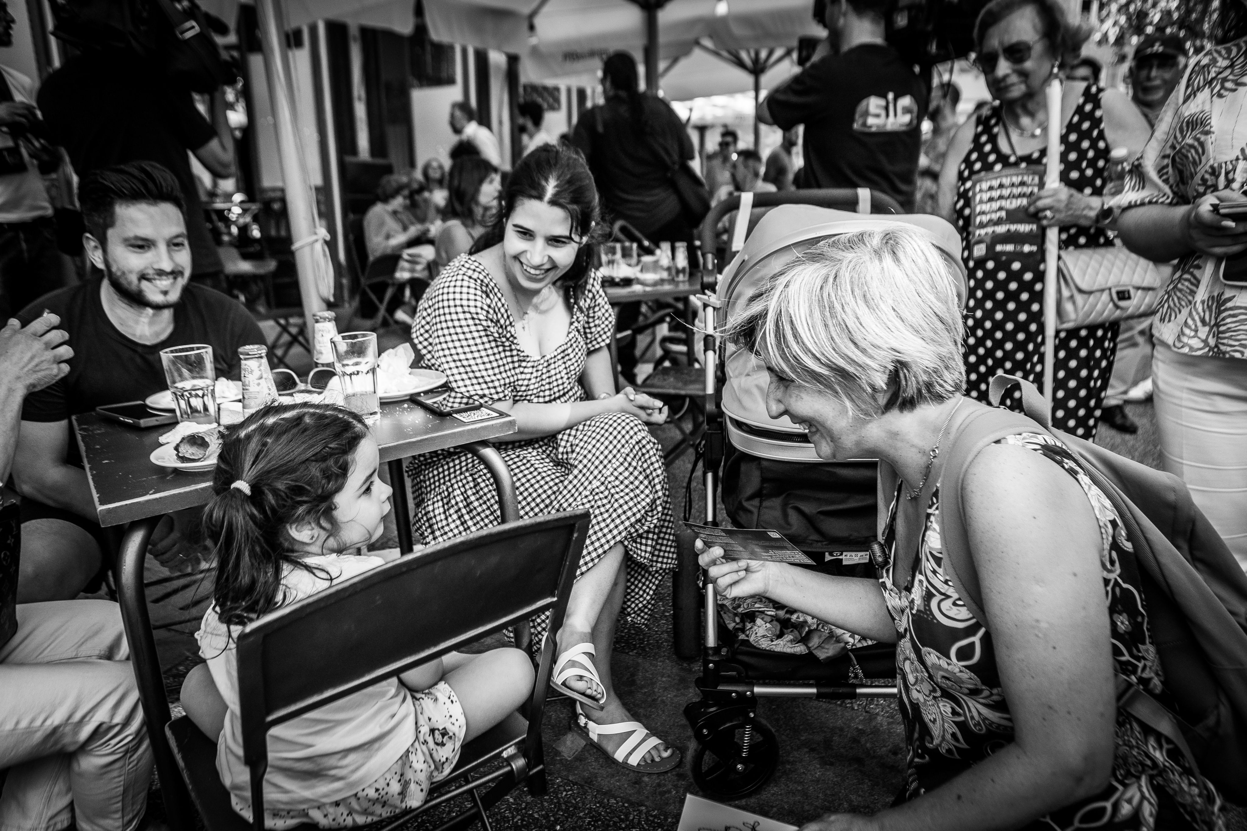 Quando encontra um par de jovens na esplanada de um café pergunta se pode deixar um papel. A resposta demora a chegar. E, quando chega, vem em inglês: