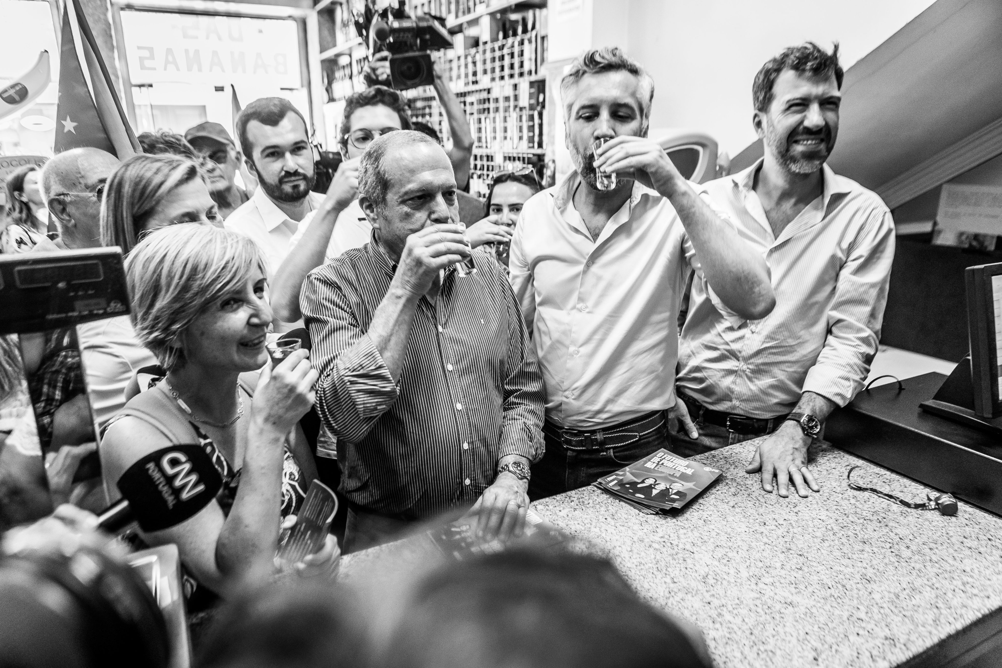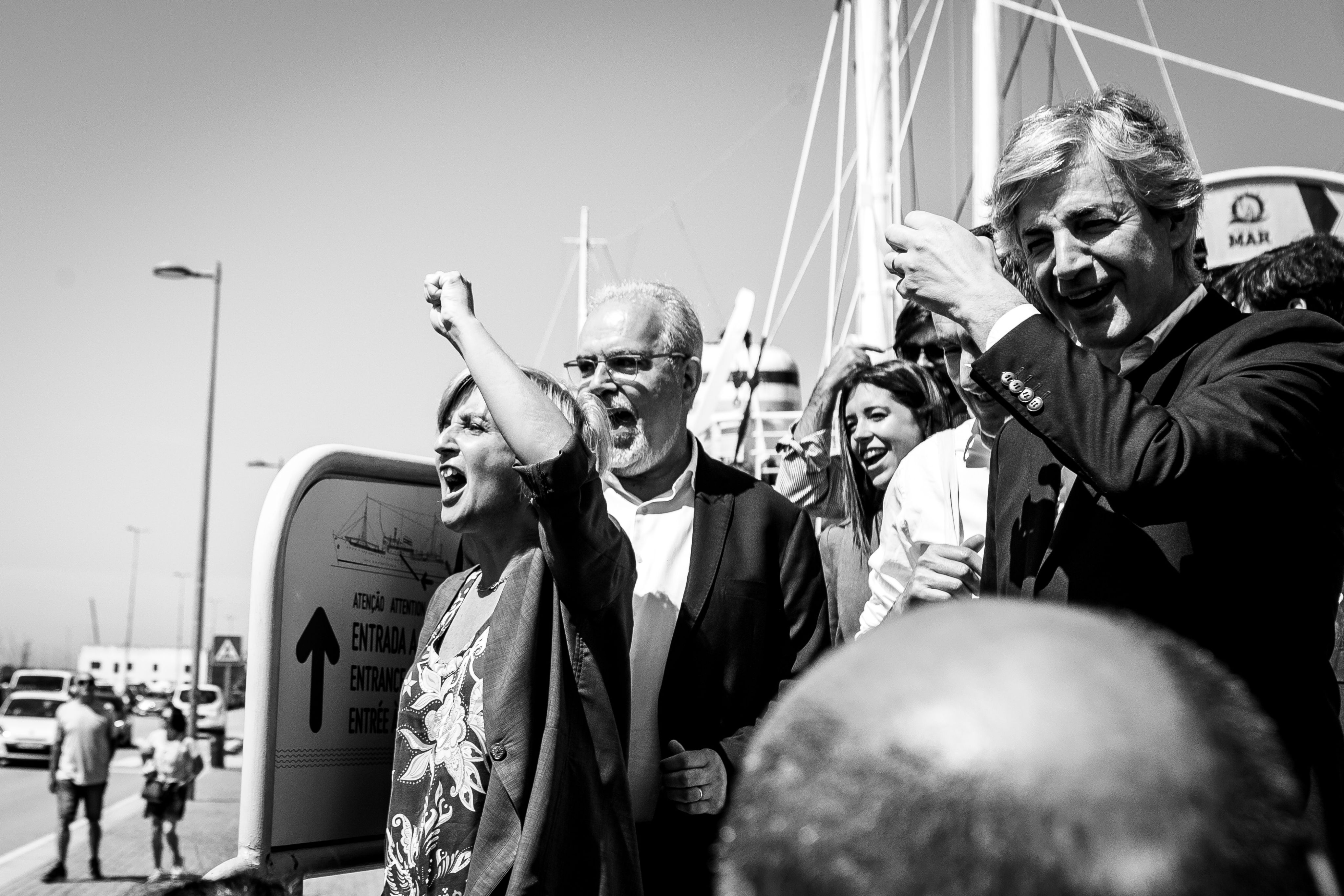 Temido sente a agenda do dia a caminhar para o fim. A equipa comenta atrasos, os jotas são pressionados a caminhar mais rápido e os cânticos já só se ouvem de vez em quando, se a marcha vai silenciosa. Ainda haverá tempo, às 17h16, para entrar n’A Brasileira, onde o elenco tomará um café à varanda, cercado por jornalistas. É lá que a socialista recebe o segundo presente do dia, um boneco em caco que também promete levar para Bruxelas. Quando finalmente a marcha começa a dissipar-se, Temido já só leva consigo, até ao carro, um saco cheio de fidalguinhos. Não foi ela que os comprou - e tudo indica que não será ela a comê-los.