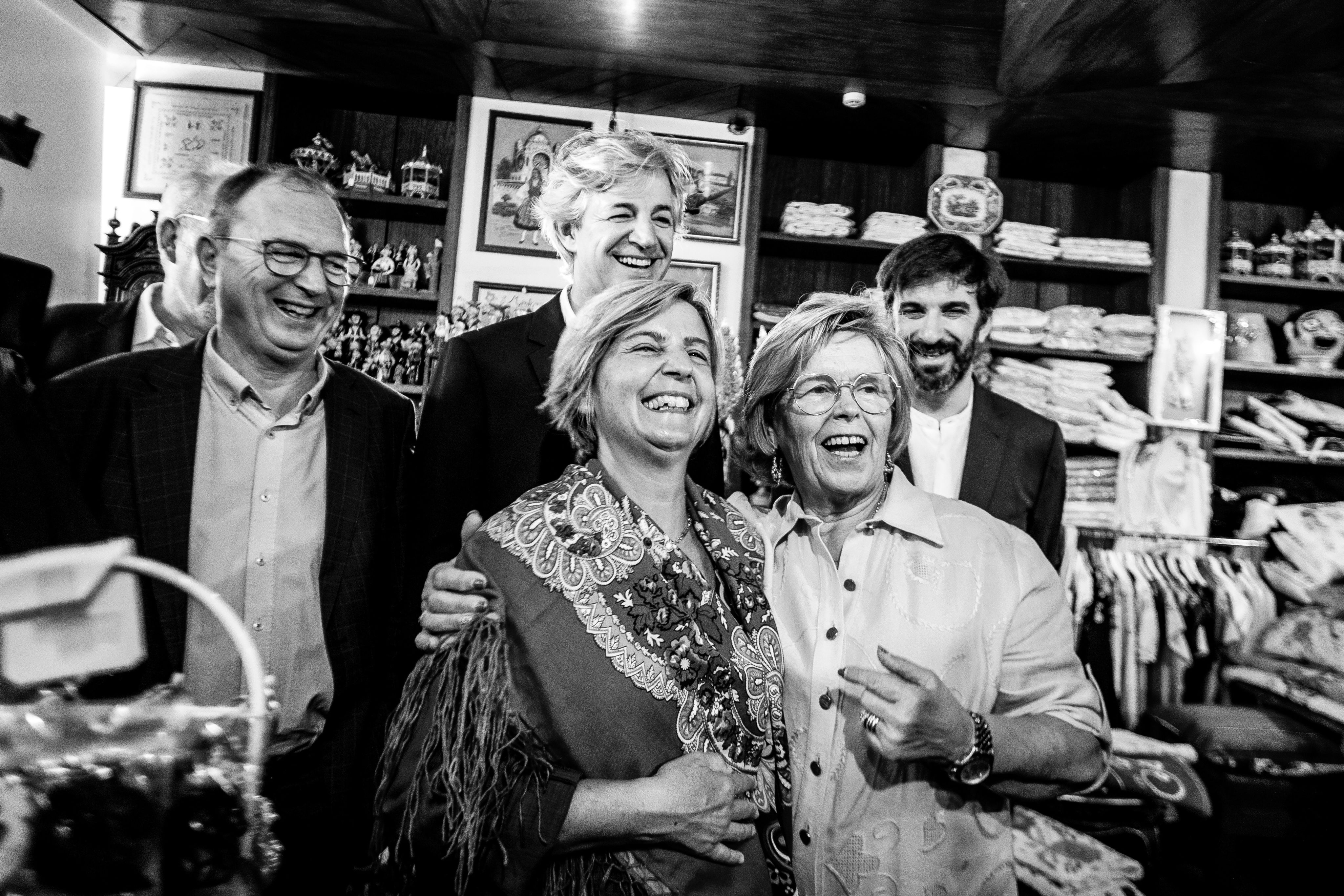 Na cidade cuja autarquia é dominada há anos pelo PSD, a socialista insiste em entrar em todos os comércios da Rua do Souto, uma das mais icónicas em Braga. Ao lado de Pedro Nuno Santos, Carlos César, presidente do partido, Bruno Gonçalves, número quatro da lista, e Inês Rodrigues, também candidata do PS, entra no número 26. Aqui, na Casa das Bananas, brinda, pela primeira vez hoje, com moscatel. Do lado de fora, duas mulheres sobem-lhe consideravelmente o ego.