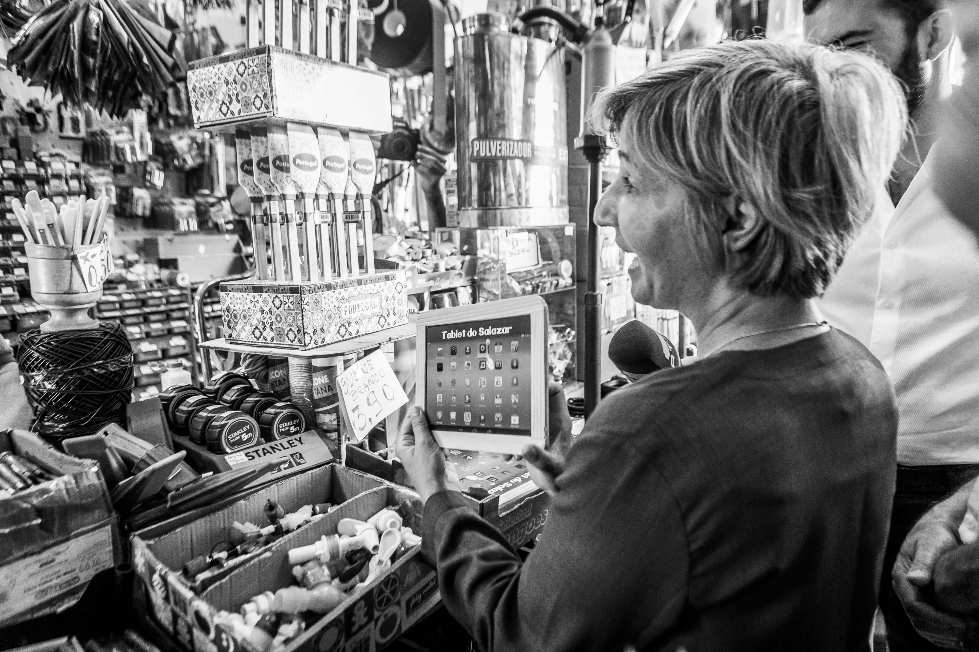 Ainda em Viana do Castelo, a socialista entra numa loja de ferragens com produtos caricatos, como percebe de imediato. Um “Tablet do Salazar”, que é na verdade uma ardósia, um sapo de caco à entrada e um dono que recusa estereótipos.