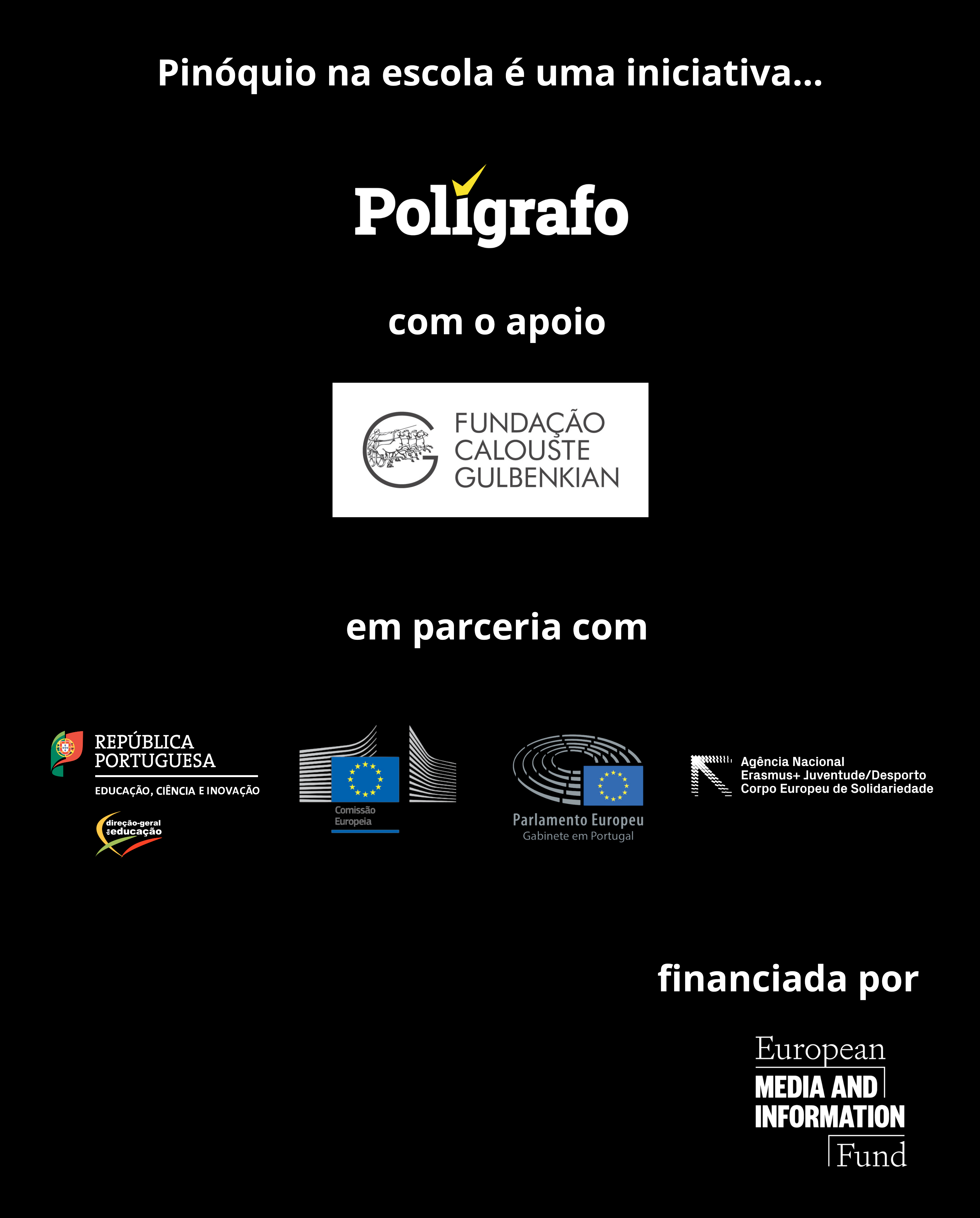 Pinóquio na Escola é um concurso promovido pela Fundação Calouste Gulbenkian, através do Fundo Europeu para os Media e Informação (EMIF), e implementado pelo Polígrafo. Conta com a parceria da Direção-Geral da Educação, Representação da Comissão Europeia em Portugal, do Gabinete do Parlamento Europeu em Portugal e da Agência Nacional Erasmus+ Juventude/ Desporto e Corpo Europeu de Solidariedade.
